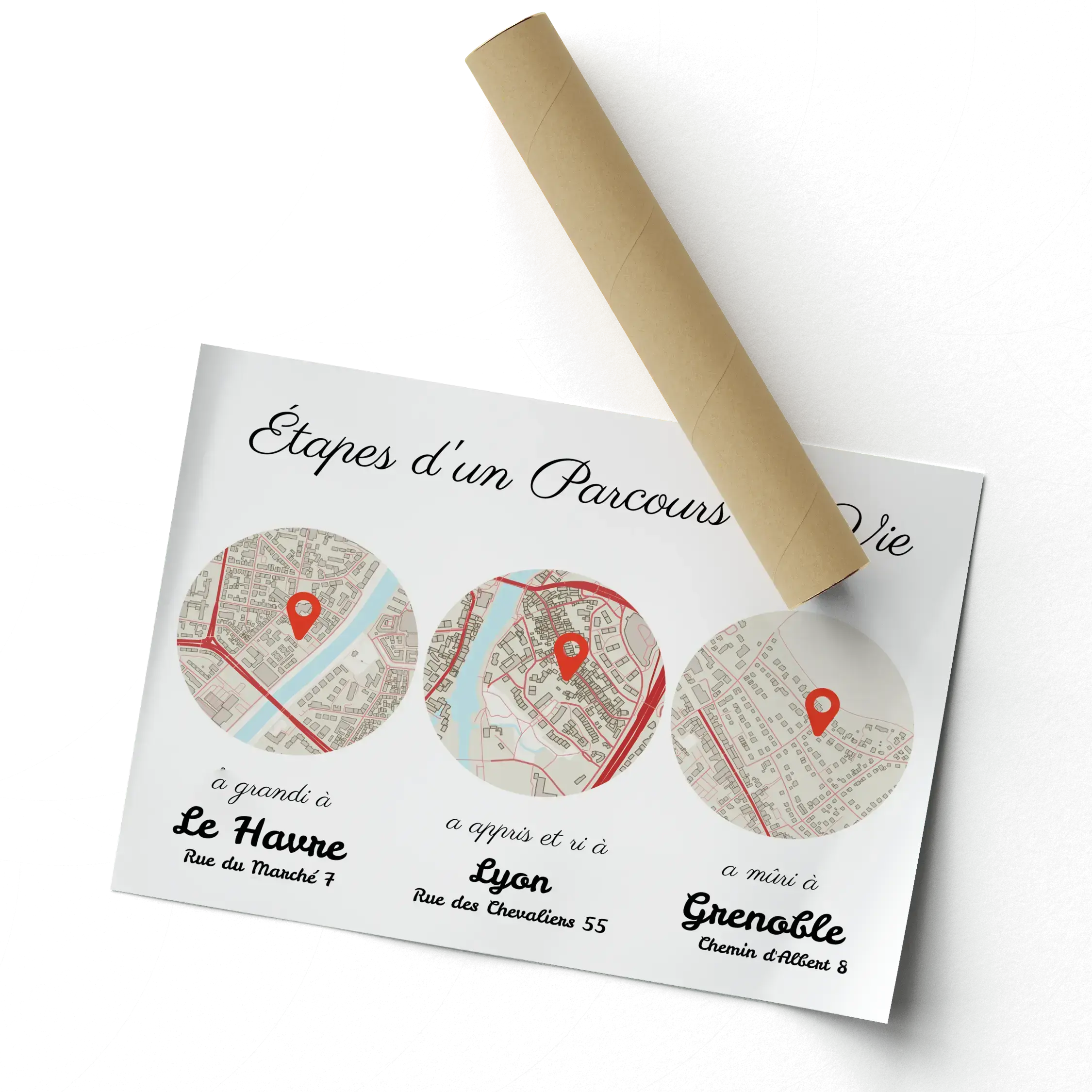 Carte personnalisée : retracez les étapes clés de la vie avec des lieux uniques et des souvenirs.